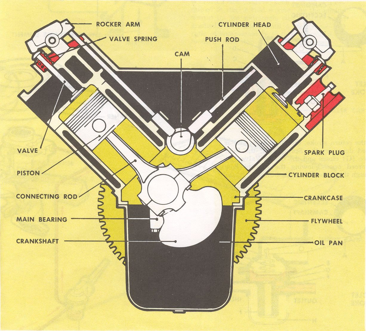 The CRANKCASE is the biggest part of the engine and, together with the OIL PAN at the bottom, it forms an oil-tight housing in which all the rotating parts of the engine operate.