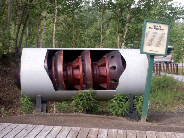 A mechanical device which is pushed through the pipeline by the oil. Several types of pigs are used to improve flow characteristics, inspect for dents and wrinkles, inspect for pipeline corrosion, and measure pipeline curvature