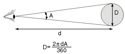 If you know how far away a planet is from you, you can determine its linear diameter D. The diameter of a planet D = 2pie × (distance to the planet) × (the planet's angular size in degrees)/360°, where the symbol pie is a number approximately equal to 3.14 (your calculator may say 3.141592653...). The figure above explains where this formula comes from. This technique is used to find the actual diameters of other objects as well, like moons, star clusters, and even entire galaxies.