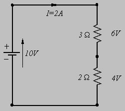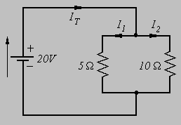 The nitty-nitty-gritty, circuit analysis examples using Ohm's Law and Kirchoff's Current and Voltage Laws. First lets look at a series circuit using Kirchoff's Voltage law and Ohm's law to find the value of the unknown resistor R. In the following circuit, it is known that a 2 ampere current flows in the circuit. If we start at point A and create a clockwise loop around the circuit, the voltage at A is zero (or it can be considered ground). Then at point B the voltage must be 10 volts because the voltage supply creates a 10 V potential between point A and point B. At C the voltage is still 10 volts because points B and C can be considered the same points (voltage does not change along an ideal wire that has no resistance). However, going to point D, there is a voltage drop across resistor R , and another voltage drop going to point E across the 2 ohm resistor. Since points A and E are the same points, the voltages there are the same, zero, and our loop is complete. Now using Ohm's Law in the form V = I R, one can find that the voltage drop (I * R) across the 2 ohm resistor is: (2 A) * (2 ohms) = 4 V. Thus, by Kirchoff ' s Voltage Law, the voltage drop across the unknown resistor must be: 10 V - 4 V = 6 V. Finally, using I = 2 A, and Ohm's law in the form R = V / I, the unknown resistance (R) is found to be R = 3 ohms. Next, lets solve a circuit using Kirchoff's Current law and Ohm's law to find the unknown current in the following parallel circuit. In the circuit, the source voltage is 20 V and the resistor values are 5 ohms and 10 ohms, respectively. Because voltage does not change along an ideal wire that has no resistance, the full 20 V from the supply appears across each resistor. Next, using Ohm's Law in the form I = V / R we find: I1 = 20 V / 5 ohms = 4 A, Finally, by Kirchoff ' s Current Law I(total) is found to be: I1 + I2 = IT Thus, I1 is 4 amps, I2 is 2 amps, and IT is 6 amps. |