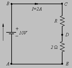 The nitty-nitty-gritty, circuit analysis examples using Ohm's Law and Kirchoff's Current and Voltage Laws. First lets look at a series circuit using Kirchoff's Voltage law and Ohm's law to find the value of the unknown resistor R. In the following circuit, it is known that a 2 ampere current flows in the circuit. If we start at point A and create a clockwise loop around the circuit, the voltage at A is zero (or it can be considered ground). Then at point B the voltage must be 10 volts because the voltage supply creates a 10 V potential between point A and point B. At C the voltage is still 10 volts because points B and C can be considered the same points (voltage does not change along an ideal wire that has no resistance). However, going to point D, there is a voltage drop across resistor R , and another voltage drop going to point E across the 2 ohm resistor. Since points A and E are the same points, the voltages there are the same, zero, and our loop is complete. Now using Ohm's Law in the form V = I R, one can find that the voltage drop (I * R) across the 2 ohm resistor is: (2 A) * (2 ohms) = 4 V. Thus, by Kirchoff ' s Voltage Law, the voltage drop across the unknown resistor must be: 10 V - 4 V = 6 V. Finally, using I = 2 A, and Ohm's law in the form R = V / I, the unknown resistance (R) is found to be R = 3 ohms. Next, lets solve a circuit using Kirchoff's Current law and Ohm's law to find the unknown current in the following parallel circuit. In the circuit, the source voltage is 20 V and the resistor values are 5 ohms and 10 ohms, respectively. Because voltage does not change along an ideal wire that has no resistance, the full 20 V from the supply appears across each resistor. Next, using Ohm's Law in the form I = V / R we find: I1 = 20 V / 5 ohms = 4 A, Finally, by Kirchoff ' s Current Law I(total) is found to be: I1 + I2 = IT Thus, I1 is 4 amps, I2 is 2 amps, and IT is 6 amps. |