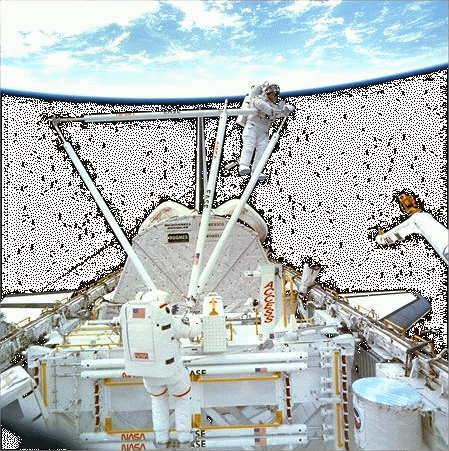 Tethers provide an astronaut with a lot of room to move around within the cargo bay. The downfall to tethers is that they are not as easily controlled as the other forms of space walks. Tethers do however allow more body movement than the RMS because you can not move your lower body while on the RMS. Both of these astronauts are connected to the shuttle by tethers. Some operations provide ability to use tethers while other operations do not.