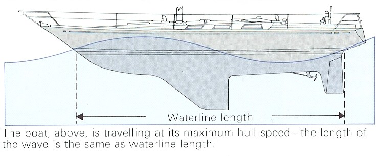 Water has the another effect of determining the maximum speed of a ship. "When a boat which does not plane moves, it creates two waves which become further apart the faster the boat moves. At a certain speed, the distance between the wavecrests is close to the waterline length of the boat and the two crests are situated near the ends of the waterline shape of the boat." (pg. 327, Bond)