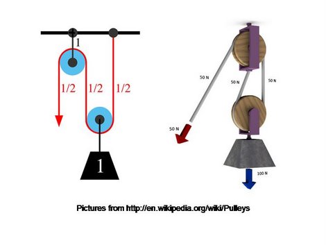 The force pulling down on the pulley, in this case the black anvil weighing 1, is equal and opposite in direction to the tension of the ropes. In order to describe the simple pulley’s effectiveness we will ignore the friction of the rope and pulley. The force needed to life is divided in two because the ceiling, or point of attachment of rope, carries half of it. The second pulley directing the rope downward has no further advantage, but simple serves to redirect the force.
