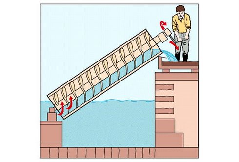 You can see the bottom of the screw dips into water, and as you turn the screw by the handle at the top, water is picked up. The 45˚ inclination of the cylinder allows the water to raise to the next thread, while the bottom of the screw picks up more water. As you turn, the water is moved to the top with relatively easy effort.