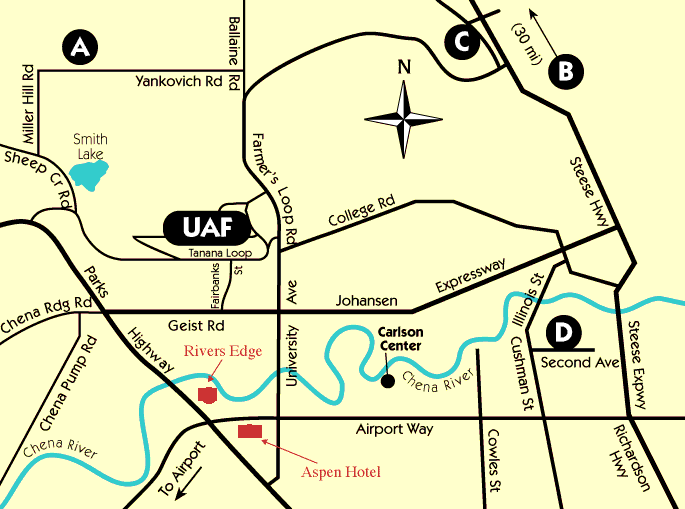 Fairbanks map (with the university campus marked UAF and the 2 hotels marked in red)