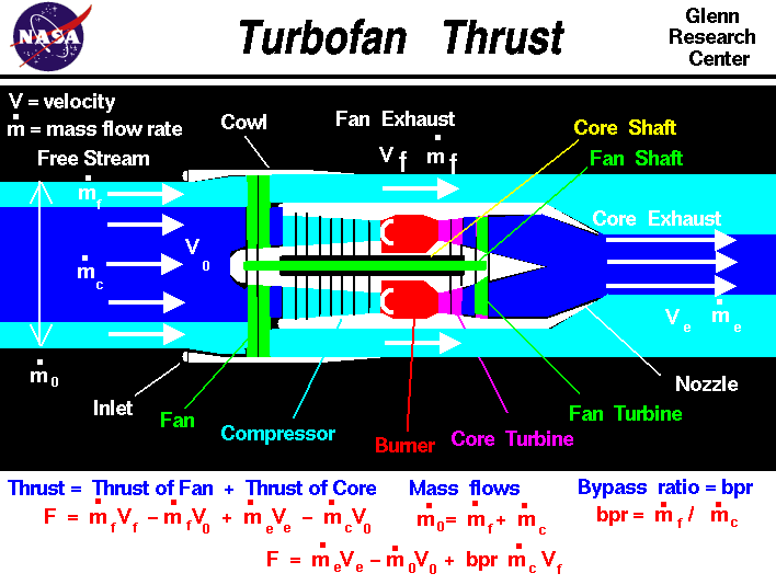 Fan: The fan is the first part of the jet engine from the front. Air is sucked into the engine and sped up by the fan. The fan also splits the air into two parts (except in the case of turbojet engines), air that will go through the engine's core and air that bypasses the other components of the engine to be pushed out of the back. Air that travels through the core will be acted upon by the compressor, combustor, pass through the turbine to provide energy to power the engine and finally leave through the nozzle. Bypass air is sped up and pushed out the back of the engine to create most of the thrust for the aircraft.